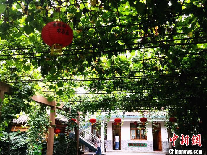 7月,中新網(wǎng)記者走進韓謝軍的農(nóng)家樂,庭院中滿是掛滿果實的葡萄架長廊,葡萄枝葉連成片,濃密的樹蔭遮蔽了夏日炎炎。