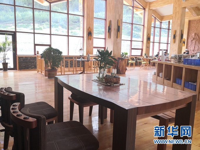 傍晚時分走進(jìn)高吉村,錯落有致的民宿散落山間,落地窗透出暖黃色的燈光。房間里藏式床鋪與原生態(tài)家具相映成趣,靠窗的榻上擺放著茶幾、茶具、綠植,一覽無余的窗外夕陽半落、云飛鳥散。游客接待中心也一改傳統(tǒng)樣式,樓上是純木質(zhì)、開放式餐廳,樓下是小橋流水、曲徑通幽的水景,游客們?nèi)齼蓛傻暮戎Х龋硎苤娨獾娜松?/p>
