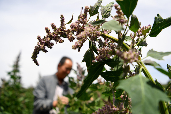 甘肅省武威市天祝藏族自治縣松山鎮(zhèn)大溝興農(nóng)種養(yǎng)殖專業(yè)合作社負責人文玉廷在地里查看藜麥生長情況(8月2日攝)。 新華社記者 陳斌 攝