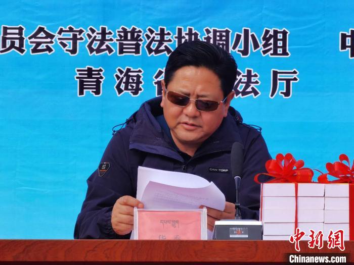 圖為青海省委統(tǒng)戰(zhàn)部副部長華秀宣讀《關(guān)于成立青海省宗教活動場所法治宣講團(tuán)的通知》。潘雨潔 攝