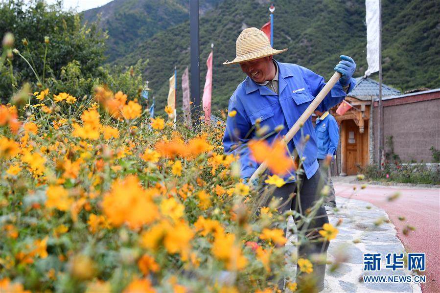 一名工人在甘南藏族自治州迭部縣電尕鎮(zhèn)謝協村村道旁的花壇干活(10月14日攝)。 新華社記者 陳斌 攝
