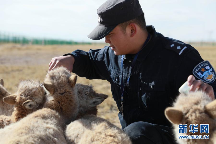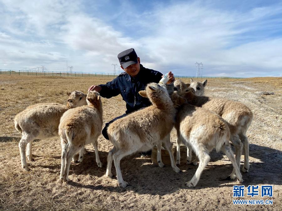 12月7日,可可西里巡山隊(duì)員達(dá)才在給藏羚羊幼仔喂奶。新華社記者 藍(lán)翔 攝