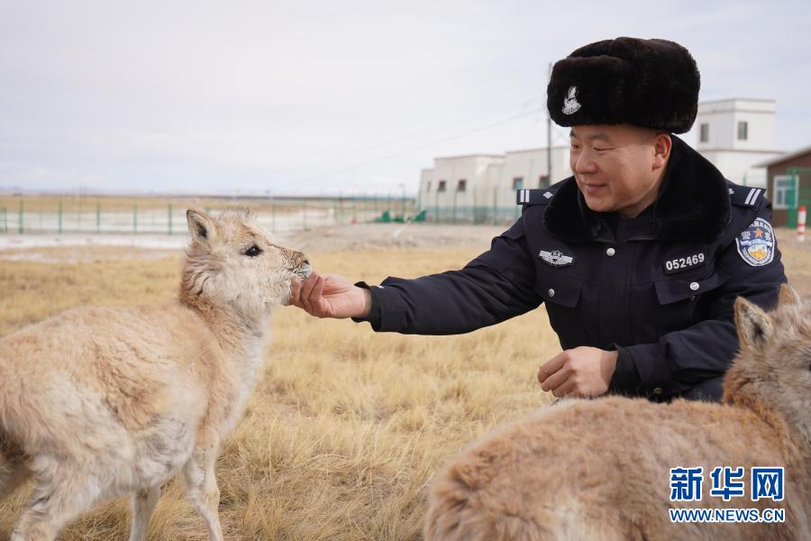 12月7日,可可西里索南達(dá)杰保護(hù)站站長(zhǎng)趙新錄在撫摸藏羚羊幼仔。新華社記者 藍(lán)翔 攝