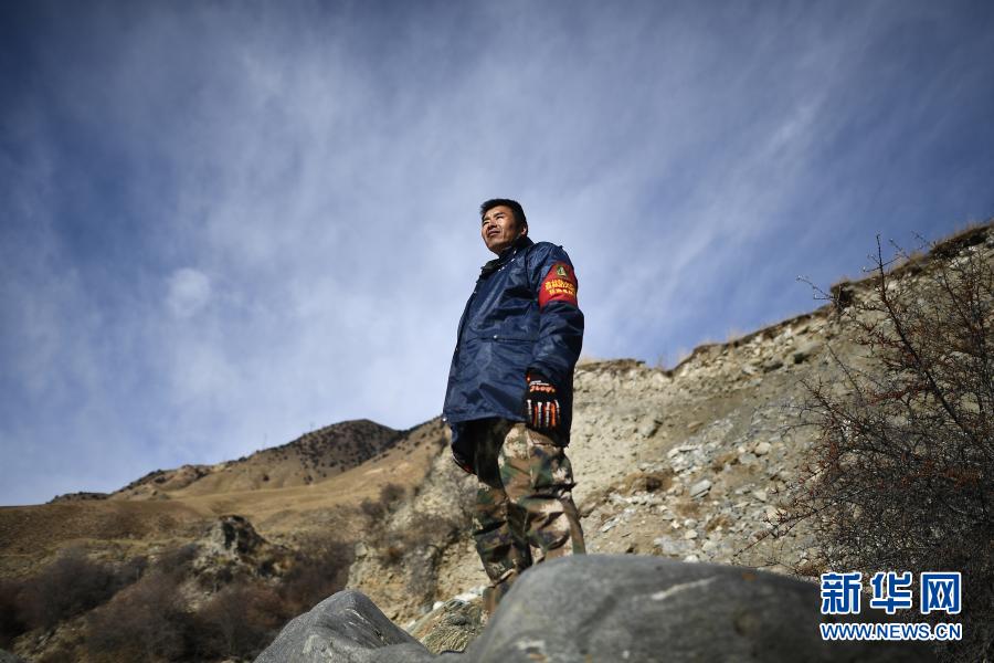 12月8日,祁連山國(guó)家公園扎麻什管護(hù)站生態(tài)管護(hù)員周曲才郎巡查途中使用望遠(yuǎn)鏡。新華社記者 張宏祥 攝