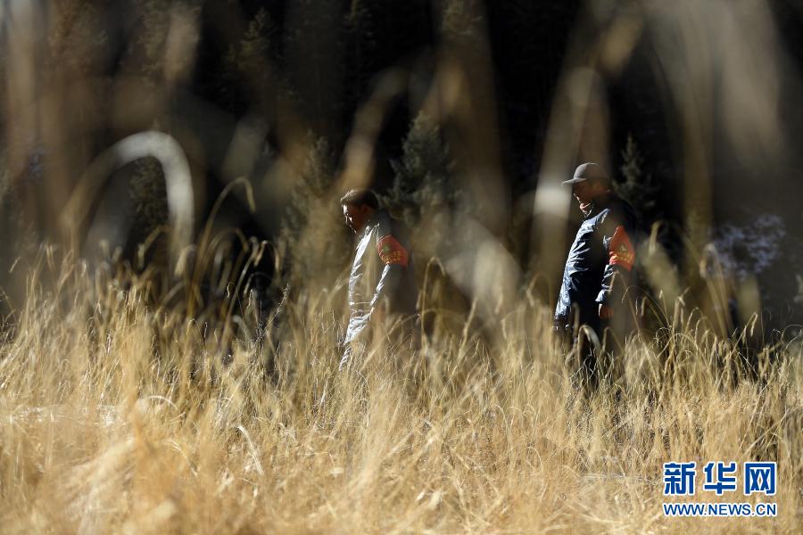 12月8日,祁連山國(guó)家公園扎麻什管護(hù)站生態(tài)管護(hù)員多杰昂秀(左)和同伴在巡護(hù)途中。新華社記者 張宏祥 攝