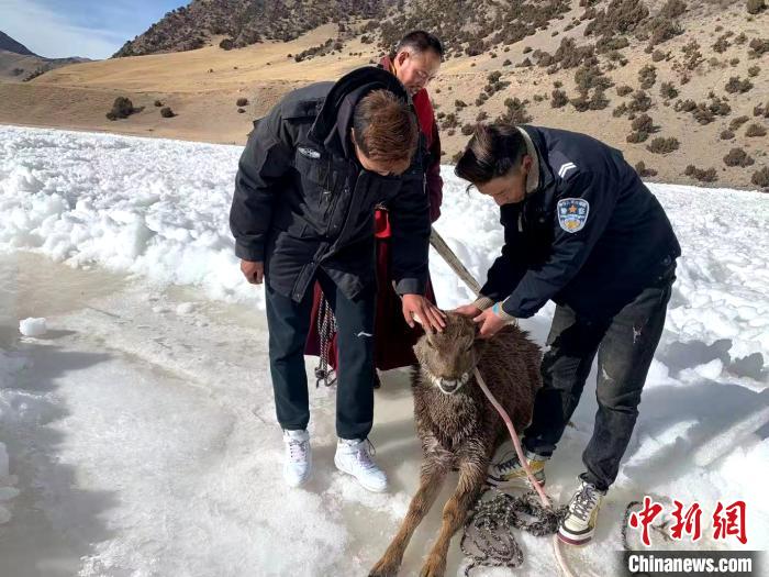 青海生態(tài)保護人員營救被困長江源冰面一級保護動物白唇鹿