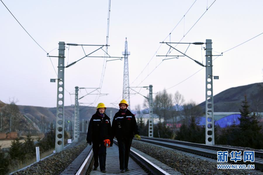2月2日,在青藏鐵路公司西寧供電段哈爾蓋工區(qū)負(fù)責(zé)鐵路線(xiàn)上,郭勝?gòu)?qiáng)(左)與羅露露在巡檢接觸網(wǎng)。新華社記者 張龍 攝