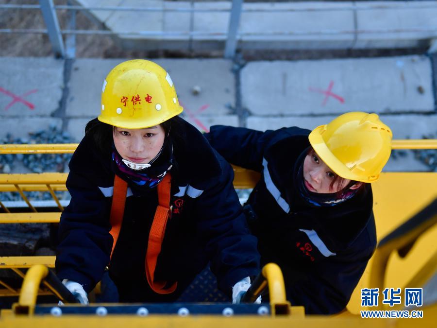 2月2日,在青藏鐵路公司西寧供電段哈爾蓋工區(qū)負(fù)責(zé)鐵路線(xiàn)上,羅露露在攀登接觸網(wǎng)支柱。新華社記者 張龍 攝