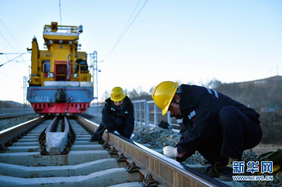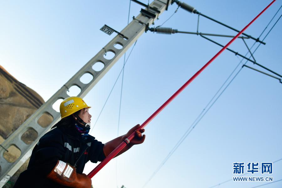 2月2日,在青藏鐵路公司西寧供電段哈爾蓋工區(qū)負(fù)責(zé)鐵路線(xiàn)上,羅露露在檢修螺絲。新華社記者 張龍 攝