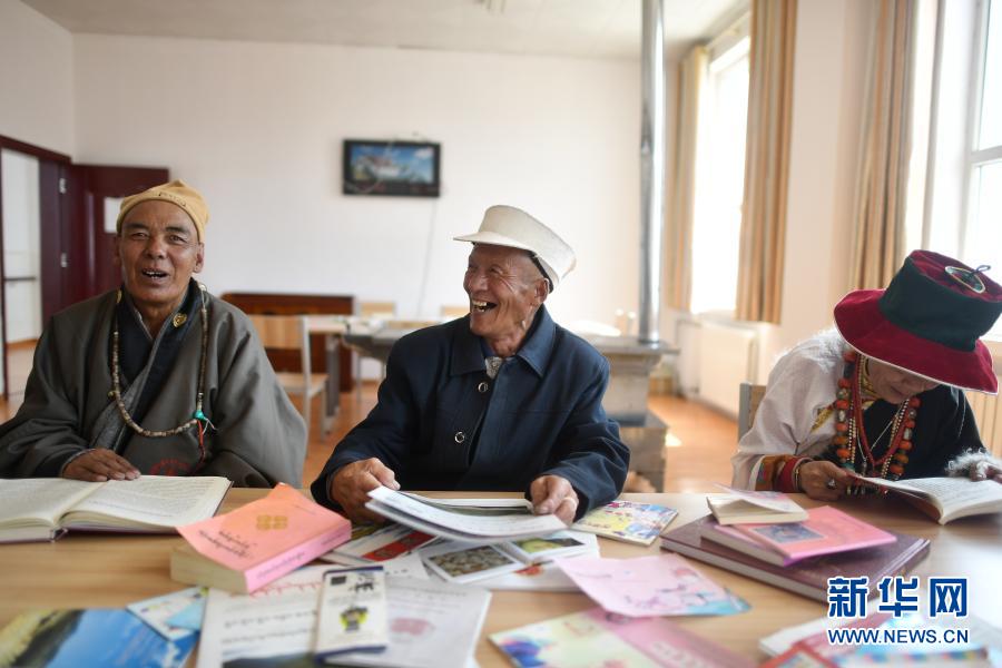 3月14日,78歲的公保(中)和同伴在治多縣幸福敬老院閱覽室內(nèi)讀報。新華社記者 張宏祥 攝