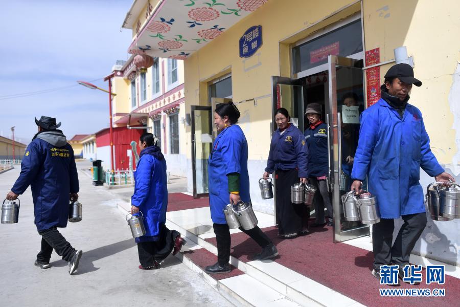 3月14日,治多縣幸福敬老院護工為行動不便的老人送餐。新華社記者 張宏祥 攝