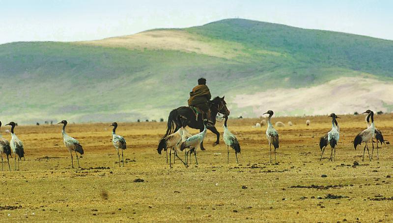 3月6日,今年的第一批黑頸鶴比往年提早了半個月飛回若爾蓋濕地,大草原上呈現(xiàn)出人與珍稀鳥類和諧共處的溫馨畫面。尹鋼 攝