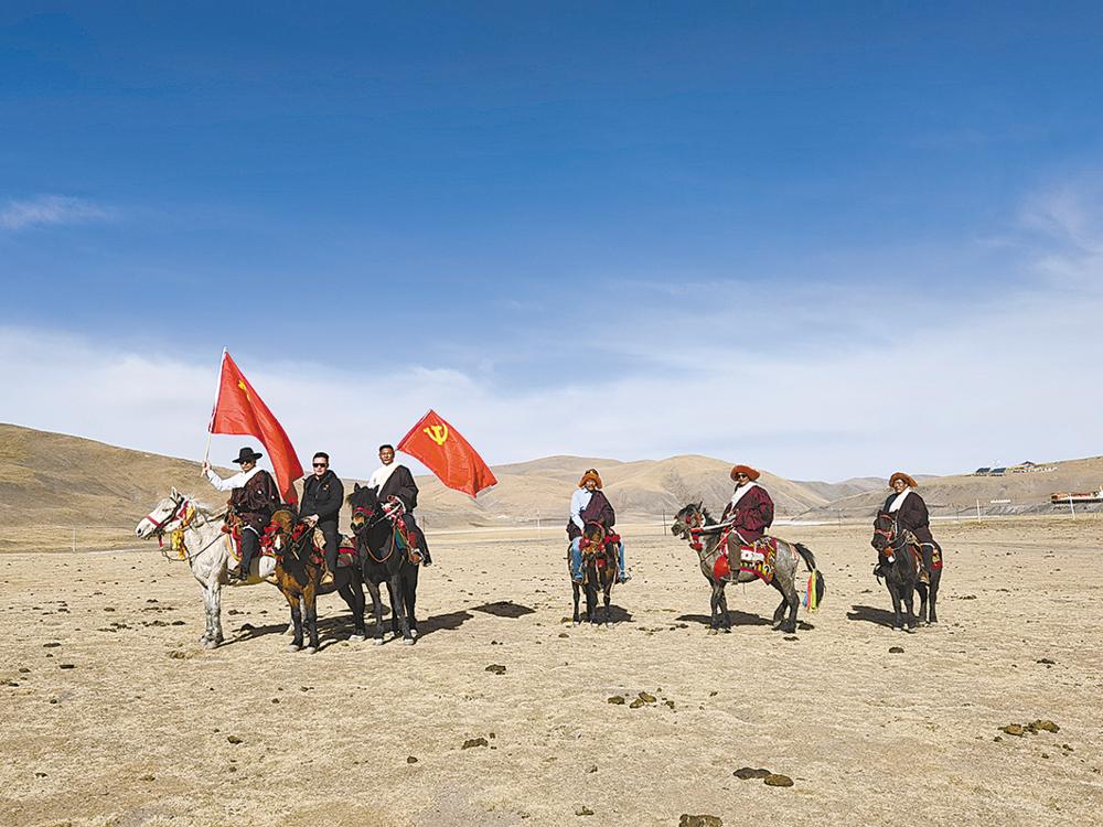 在玉樹藏族自治州曲麻萊縣葉格鄉(xiāng)龍麻村,一陣馬蹄聲由遠而近,牧民江措趕忙放下手中的活從帳篷里探出頭來,定睛一看,幾個熟悉的身影進入視線。走在最前面的干部手拿一面鮮紅的黨旗隨風(fēng)飄動,江措激動地向大家打起了招呼。