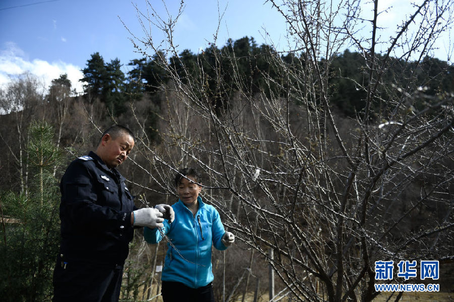 4月15日,在寺溝景區(qū)警務室旁邊的空地上,趙延壽與妻子田玉秀在修剪果樹。新華社記者 張龍 攝