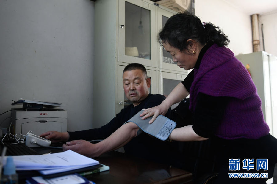 4月16日,在寺溝景區(qū)警務室,趙延壽在妻子田玉秀幫助下量血壓。新華社記者 張龍 攝