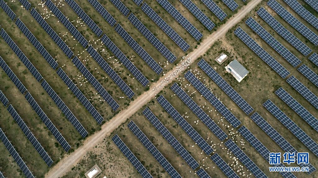 羊群在青海省海南藏族自治州共和縣光伏產(chǎn)業(yè)園吃草(2019年6月16日攝,無人機(jī)照片)。新華社 吳剛 攝