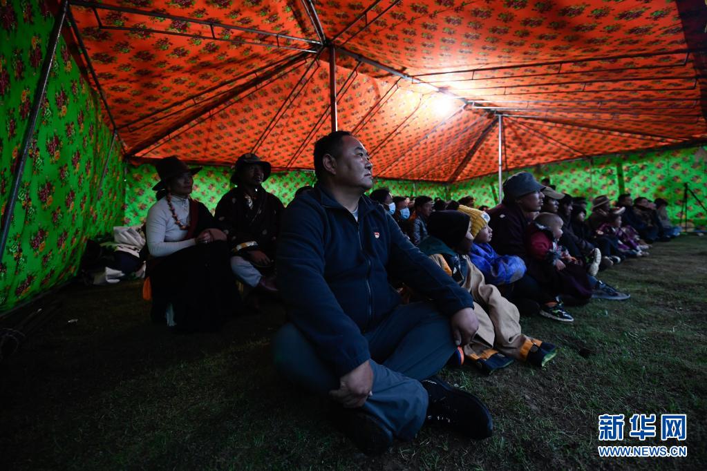 8月3日,在瑪沁縣當(dāng)洛鄉(xiāng)貢龍村的夏季草場(chǎng)上,牧民群眾在看電影。新華社記者 張龍 攝