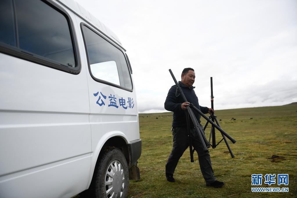 8月3日,在瑪沁縣當(dāng)洛鄉(xiāng)貢龍村的夏季草場(chǎng)上,南拉才讓在布置放映器材。新華社記者 李占軼 攝