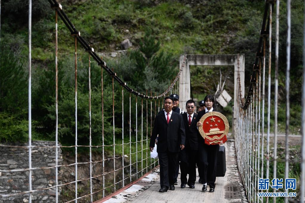 8月7日,班瑪縣人民法院工作人員在林區(qū)懸掛國徽,布設巡回法庭。新華社記者 張龍 攝