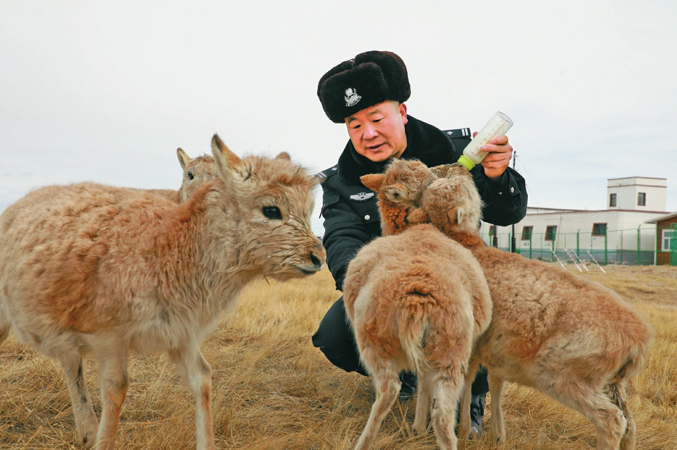 陽(yáng)光將索南達(dá)杰保護(hù)站前的藏羚羊雕像照得金光閃閃。保護(hù)站的藏羚羊“幼兒園”里,兩只新“入園”的小羊緊跟著“羊媽媽”,不時(shí)用腦袋蹭蹭“羊媽媽”的腿,或者在“羊媽媽”的腋下和腹部鉆來(lái)鉆去,嬉戲玩耍。