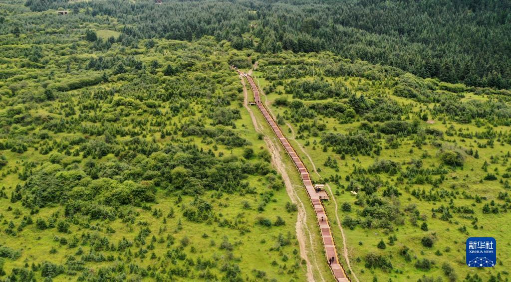 游客行走在扎尕那景區(qū)的木棧道上(8月28日攝,無(wú)人機(jī)照片)。新華社記者 杜哲宇 攝
