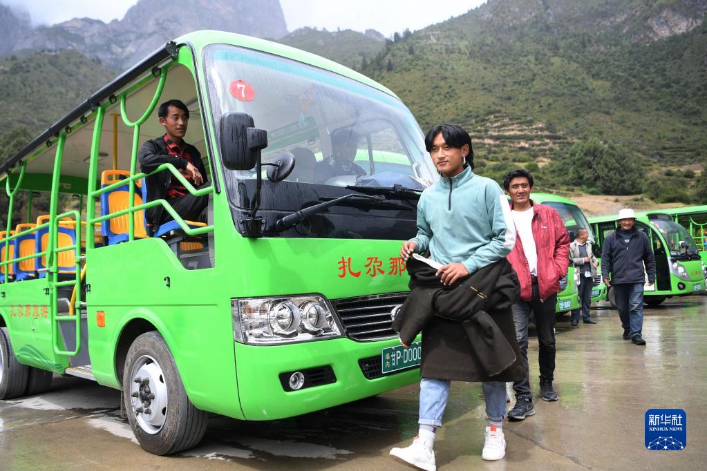 扎尕那村的幾位村民從景區(qū)觀光車??奎c(diǎn)走過(8月28日攝)。新華社記者 陳斌 攝
