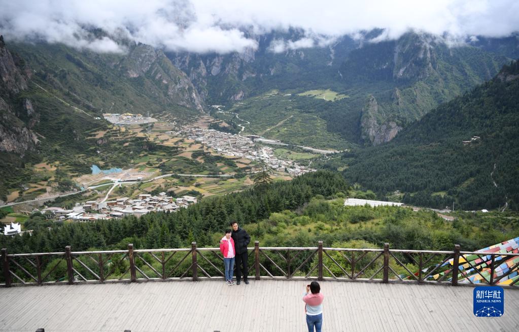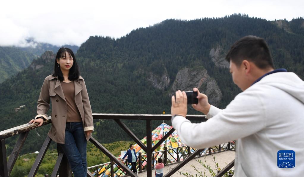 游客在扎尕那景區(qū)內(nèi)的觀景臺(tái)拍照留念(8月28日攝)。新華社記者 杜哲宇 攝