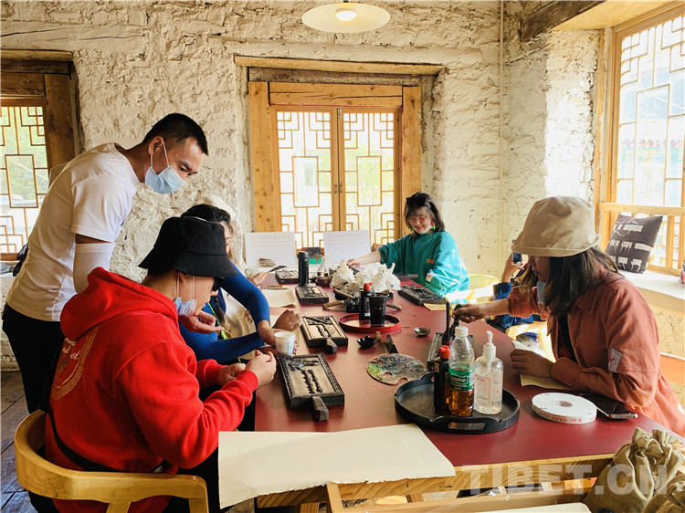 圖為游客體驗(yàn)藏族傳統(tǒng)美術(shù)工藝