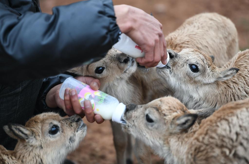 2020年7月7日,三江源國(guó)家公園管理局長(zhǎng)江源園區(qū)可可西里管理處卓乃湖保護(hù)站的工作人員在給藏羚羊幼仔喂奶。新華社記者 薛玉斌 攝