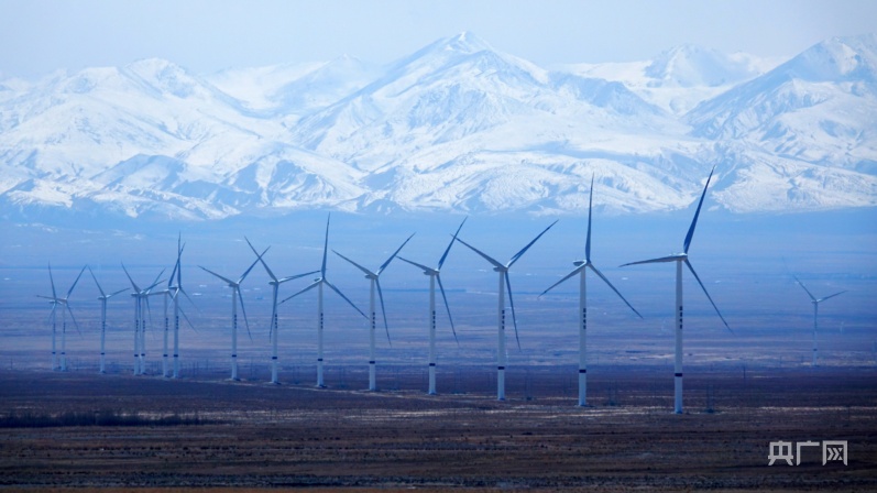 雪山下的風力發(fā)電機組(央廣網(wǎng)記者 張海東 攝)