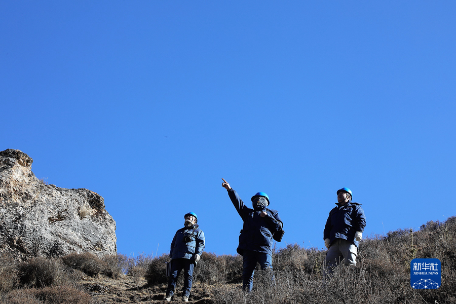 1月19日,國(guó)家電網(wǎng)青海省電力公司檢修公司輸電檢修中心專業(yè)班組成員在巡線途中查看線路運(yùn)行情況。新華社記者 趙玉和 攝