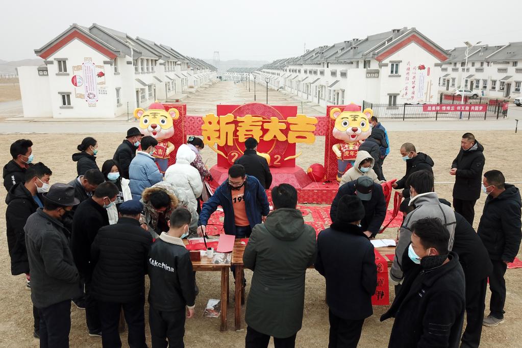 1月25日,在蘭州新區(qū)舟曲避險(xiǎn)搬遷安置點(diǎn),舟曲地質(zhì)災(zāi)害避險(xiǎn)搬遷第一臨時(shí)黨支部組織書法家給搬遷群眾送春聯(lián)。新華社記者 范培珅 攝