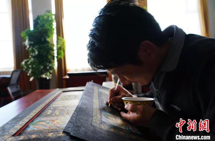 走進非物質(zhì)文化遺產(chǎn)綜合傳習(xí)中心(熱貢文化)內(nèi),幾十名學(xué)員端坐在桌前,持竹筆蘸著金汁或銀汁在特質(zhì)的藏紙上抄寫經(jīng)文,另一側(cè),幾名學(xué)員盤腿而坐,在寫好的金書上開始繪制唐卡。