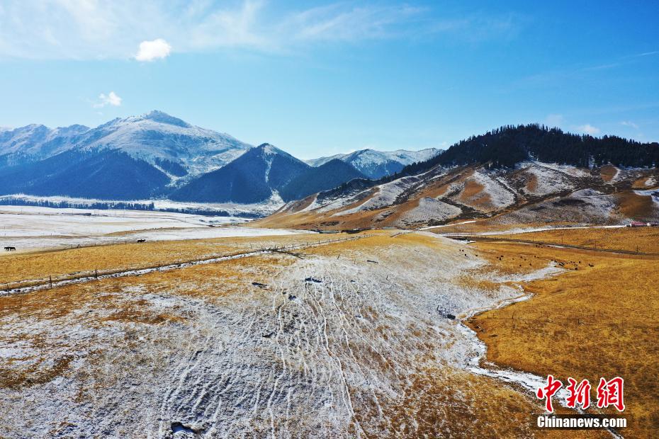 一場(chǎng)春雪過后,青海省海北藏族自治州祁連山國(guó)家公園青海片區(qū)群山被白雪覆蓋,云霧繚繞,金色的草場(chǎng)、潔白的羊群和蔚藍(lán)的天空相映成趣,美不勝收。馬銘言 攝