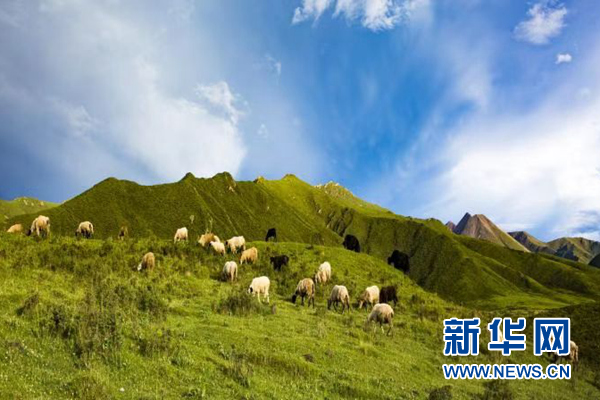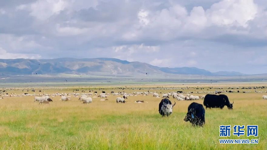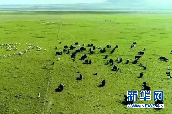 海南州興海縣一處牧場上牛羊在覓食。新華網(wǎng)發(fā)