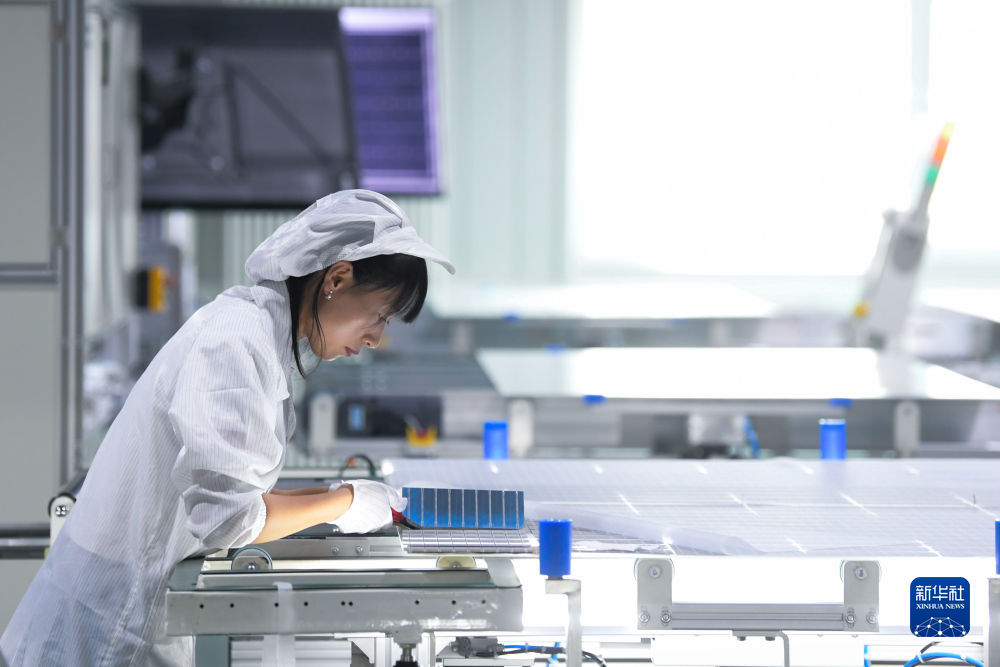 6月7日,青海隆基樂葉光伏科技有限公司工人在工廠內檢查光伏組件。新華社記者 張龍 攝