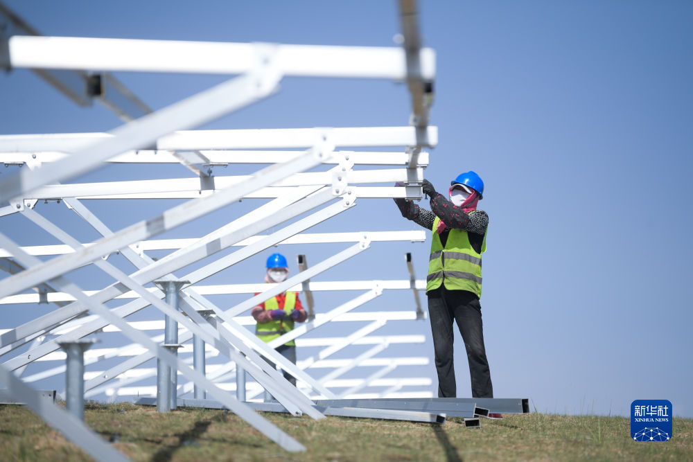 6月8日,工人在國家能源集團海南基地共和縣100萬千瓦牧光儲二期20萬千瓦建設項目施工。新華社記者 張龍 攝