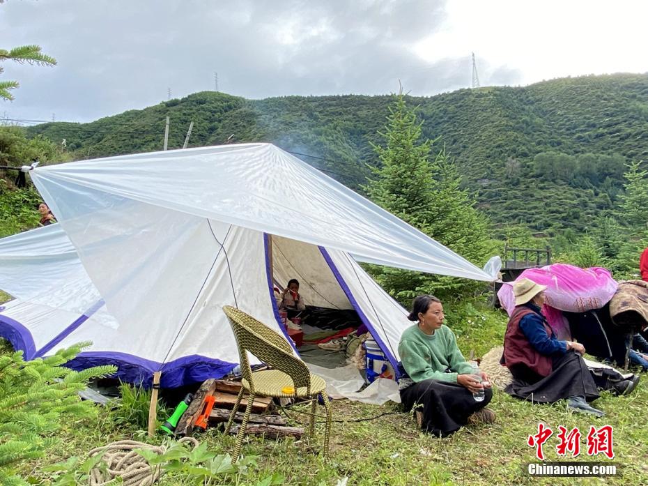 馬爾康市草登鄉(xiāng)呷秋受災(zāi)村民坐在自己的帳篷前小憩。四川森林消防 供圖
