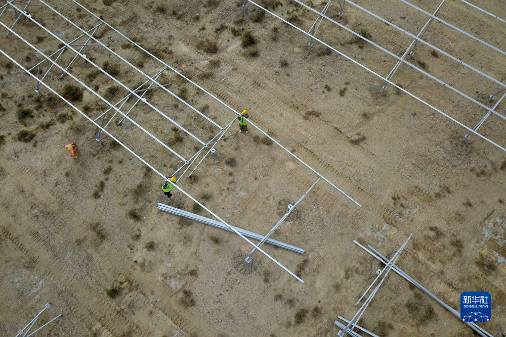 6月7日,在國家電投集團(tuán)黃河公司德令哈220萬千瓦多能互補項目一期100萬千瓦光伏項目建設(shè)現(xiàn)場,工人安裝光伏支架(無人機照片)。新華社記者 范培珅 攝