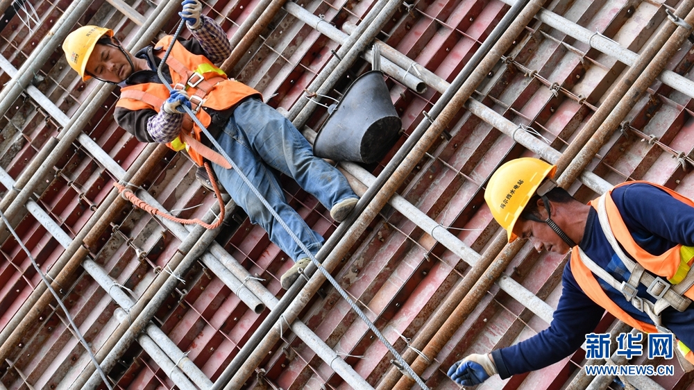 工人在地下廠房施工現(xiàn)場作業(yè)。