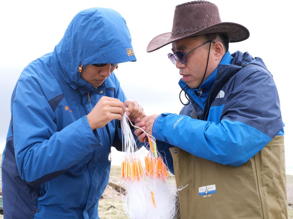 6月12日,李偉(右)和助手王馳繹在長江南源當曲河畔做采樣準備工作。新華社記者 童昊 攝
