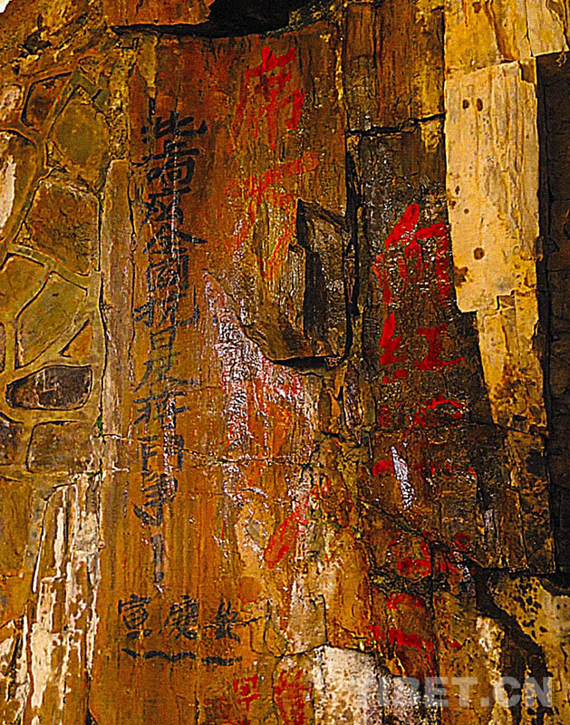 圖為一九三五年七月,中國工農(nóng)紅軍二方面軍第六軍團在長征途中,曾路過班瑪、久治一帶,并在班瑪絨玉地區(qū)的森林石壁上刻下的“北上響應全國抗日反蔣斗爭”的標語