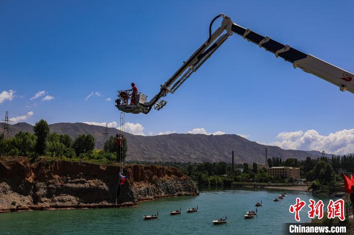 圖為演練現(xiàn)場(chǎng),登高平臺(tái)消防車負(fù)角度峽谷救援。黃開森 攝