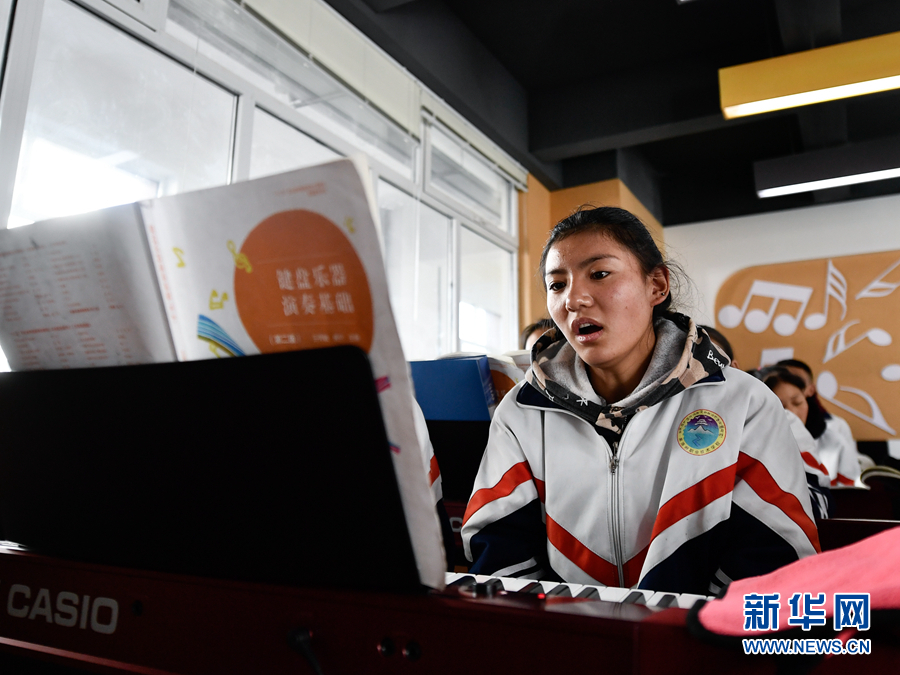 在果洛藏族自治州職業(yè)技術(shù)學(xué)校,2020級(jí)學(xué)前教育專(zhuān)業(yè)學(xué)生楊央在上音樂(lè)課。(資料圖)新華社記者 張龍 攝
