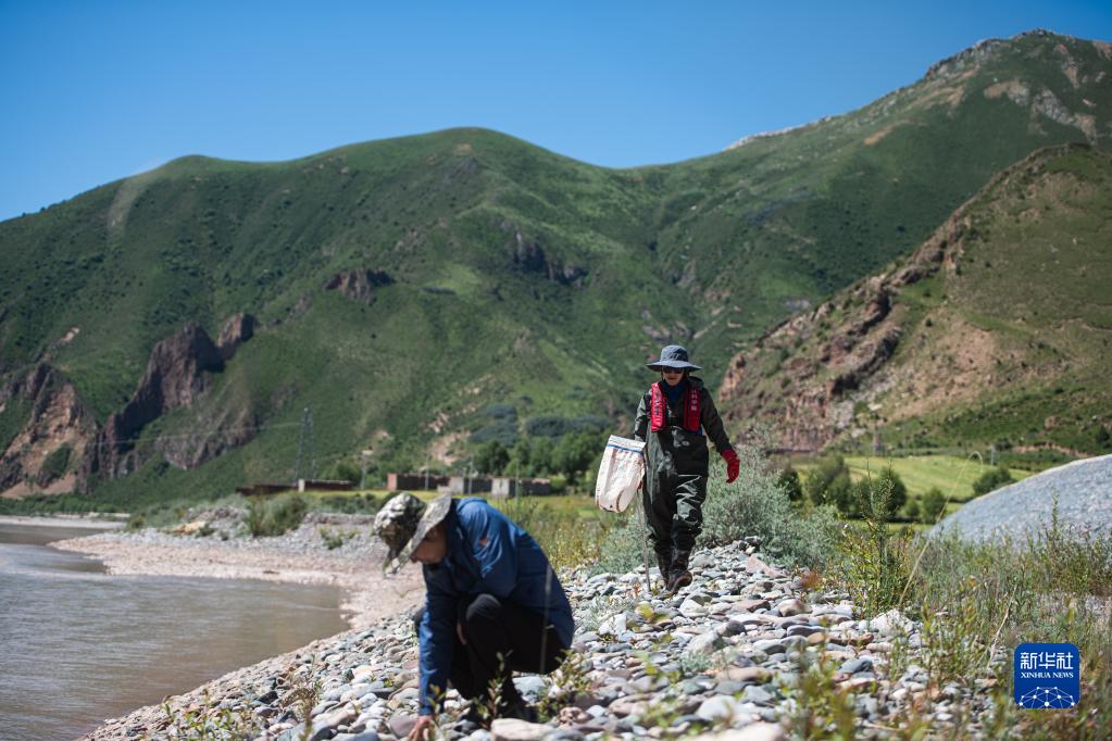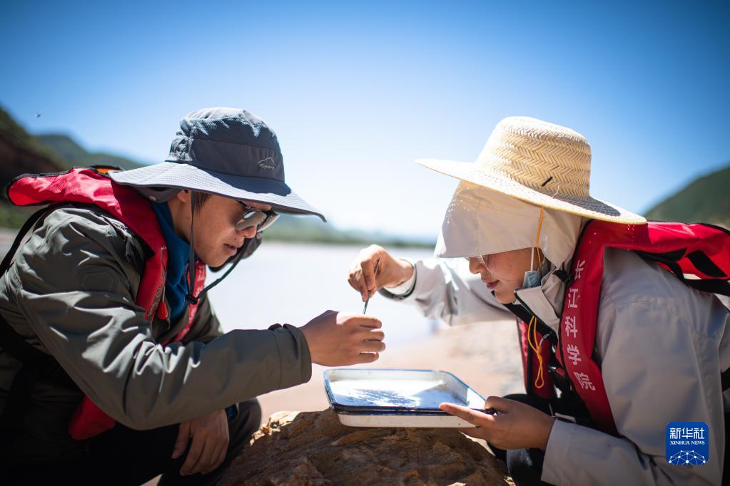 7月24日,長(zhǎng)江科學(xué)院科考隊(duì)員劉晗(右)在瀾滄江源區(qū)的扎曲采集魚(yú)類(lèi)樣本。新華社記者 肖藝九 攝