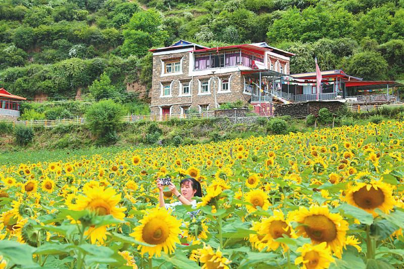 依托東西部協(xié)作和省內(nèi)對(duì)口幫扶資金,馬爾康市與浙江省平陽(yáng)縣、成都崇州市建立三方共建機(jī)制,借鑒“公園城市鄉(xiāng)村表達(dá)”理念,為鄉(xiāng)村量身定制發(fā)展規(guī)劃,采取“一山一水一藏寨,一村一產(chǎn)一花語(yǔ)”模式,探索以“花”繪點(diǎn)。洛威村流轉(zhuǎn)300多畝土地種下向日葵,聚力打造“花語(yǔ)藏寨”鄉(xiāng)村振興示范點(diǎn)。