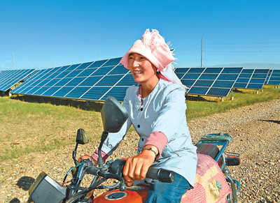 落日余暉中,牧民索南卓瑪騎著一輛摩托車,沿著歸家的方向,緩緩跟在羊群后面?!白詮难b了光伏板,生態(tài)治理同步發(fā)力,一些戈壁灘變成了綠地,我們的生活也越來越好了。”對眼前土地發(fā)生的變化,生于斯長于斯的索南卓瑪深有感觸。