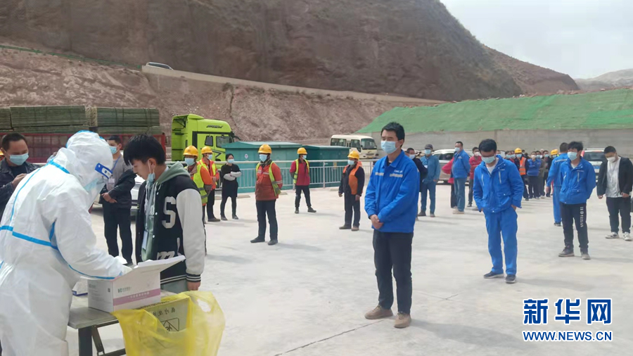 瑪爾擋水電站建設(shè)現(xiàn)場,施工人員排隊(duì)進(jìn)行核酸檢測。新華網(wǎng) 劉小芳 攝