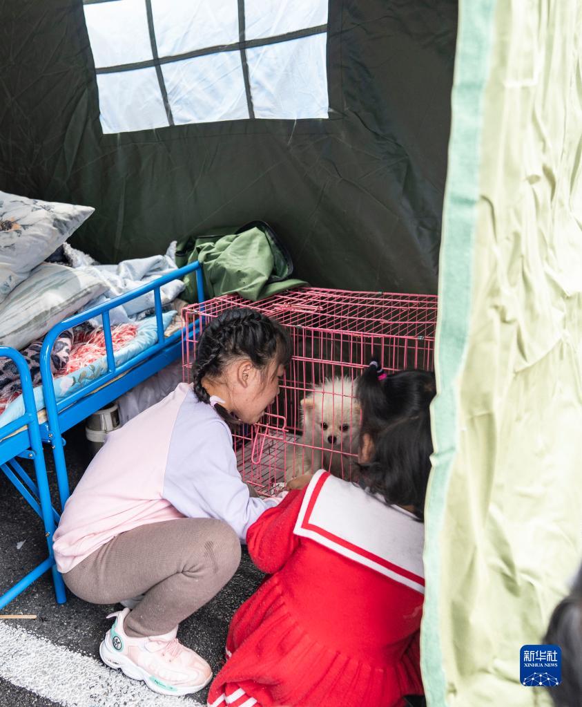 9月6日,在四川甘孜州瀘定縣磨西鎮(zhèn)海螺溝廣場受災(zāi)群眾臨時安置點,兒童與從家中帶過來的小狗玩耍。新華社記者 才揚 攝
