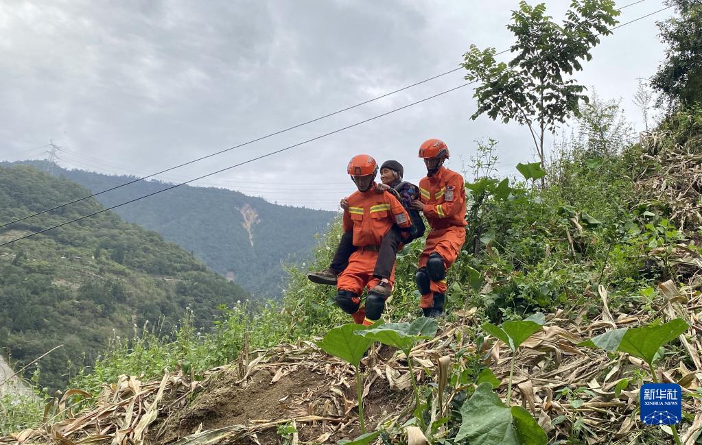 9月6日,四川森林消防總隊甘孜支隊消防員將一位老人從瀘定縣得妥鎮(zhèn)紫雅場村安全轉(zhuǎn)移出去。新華社 魏紅 攝